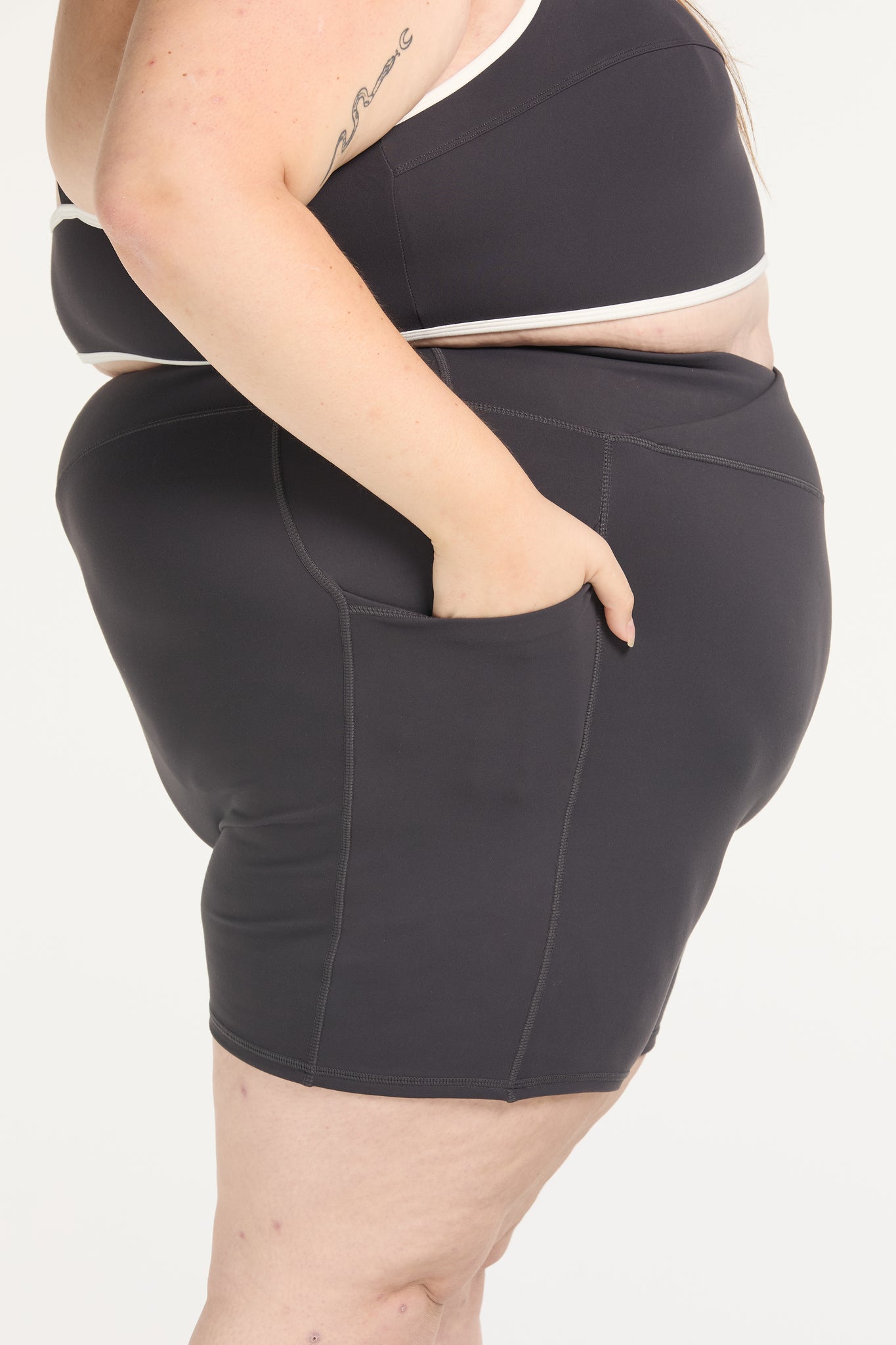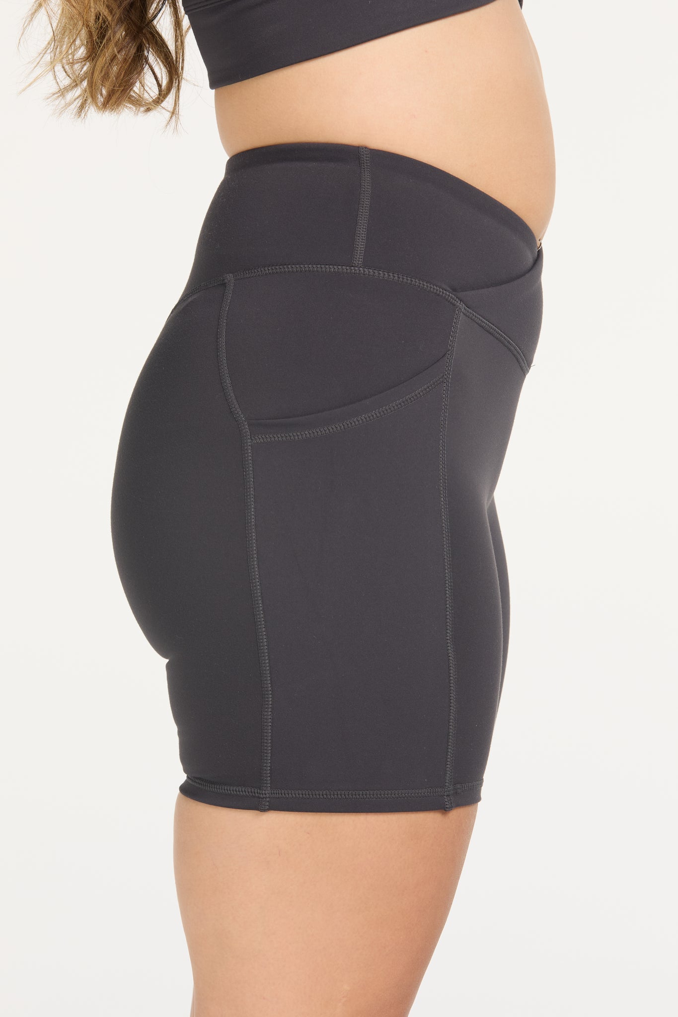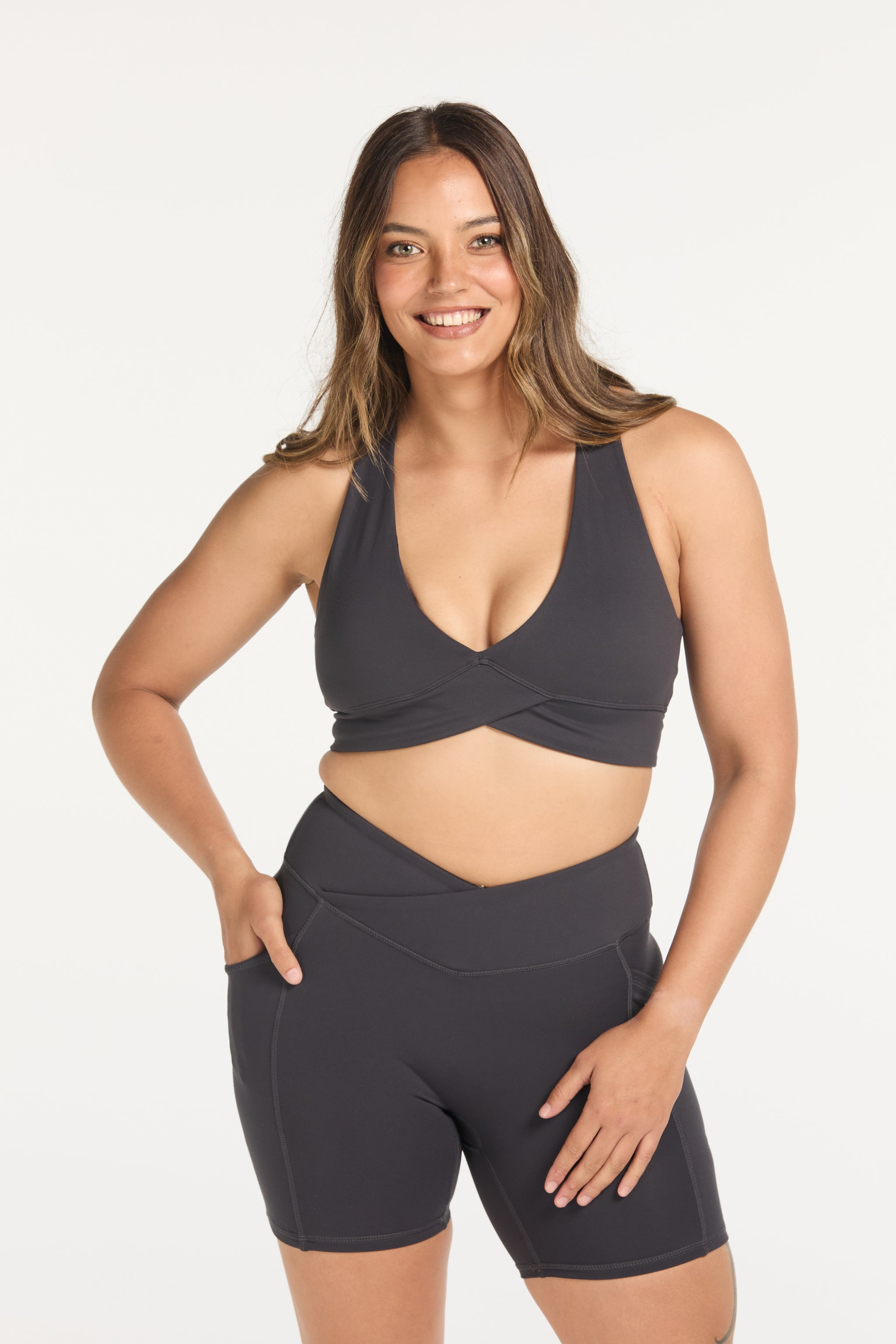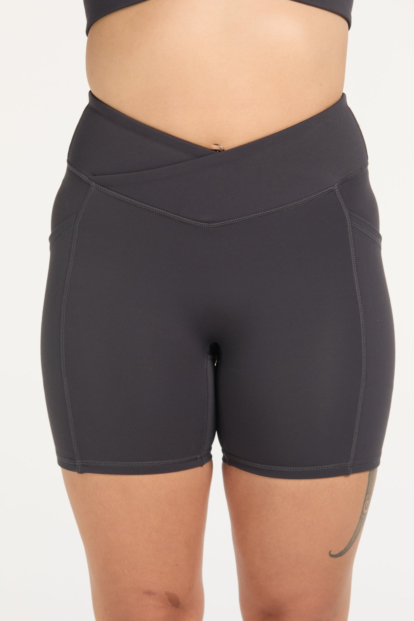 Introducing the Auahi Cross-Over Mid Short — made using our signature buttery & soft Staple fabric that you all know and love. These mid shorts offer a flattering cross over at the front design in the band, pockets on both sides and no front seam with our usual Hine logo at the back.